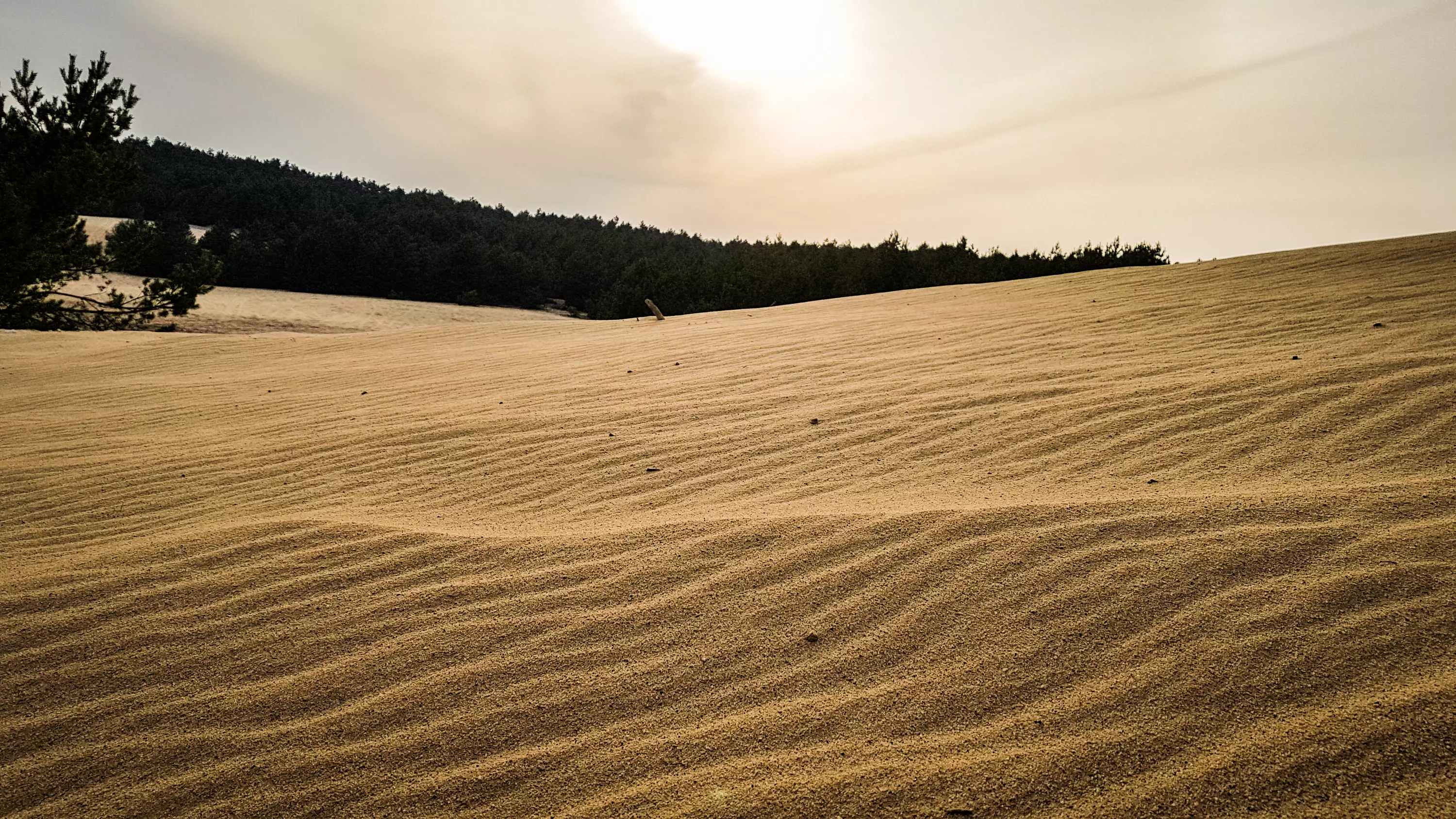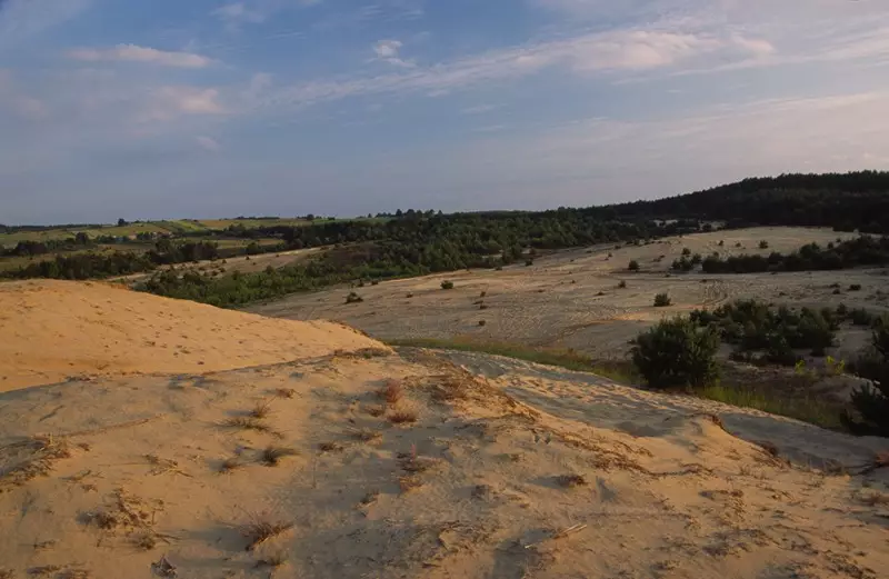 a tereny zalesione zajmują 30 ha. W niektórych miejscach wydmy dochodzą do 30 m wysokości.