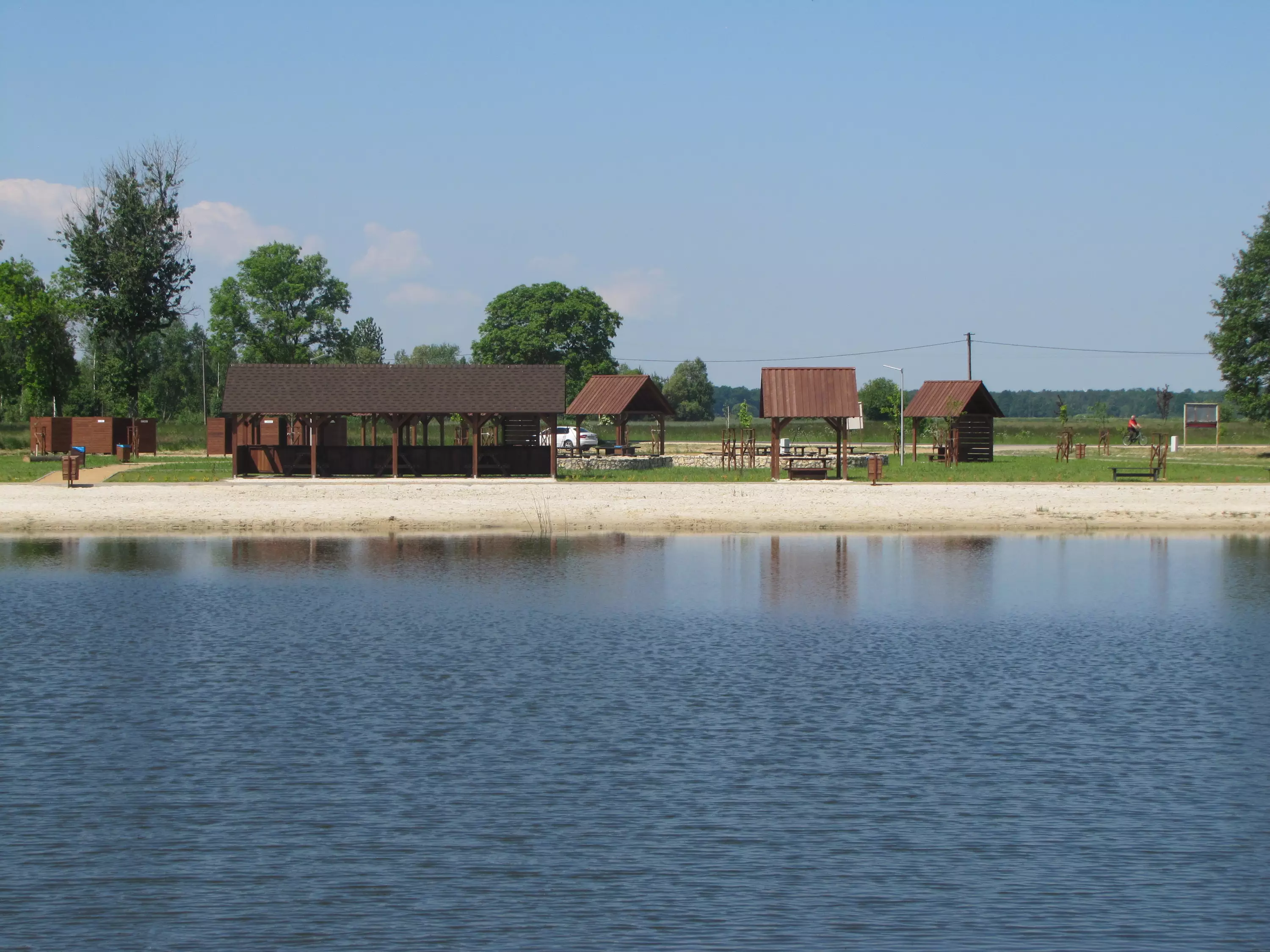 z przyległym terenem rekreacyjnym: piaszczystą plażą, altanami, stanowiskami do grilla, placem zabaw dla dzieci i boiskiem do piłki plażowej.